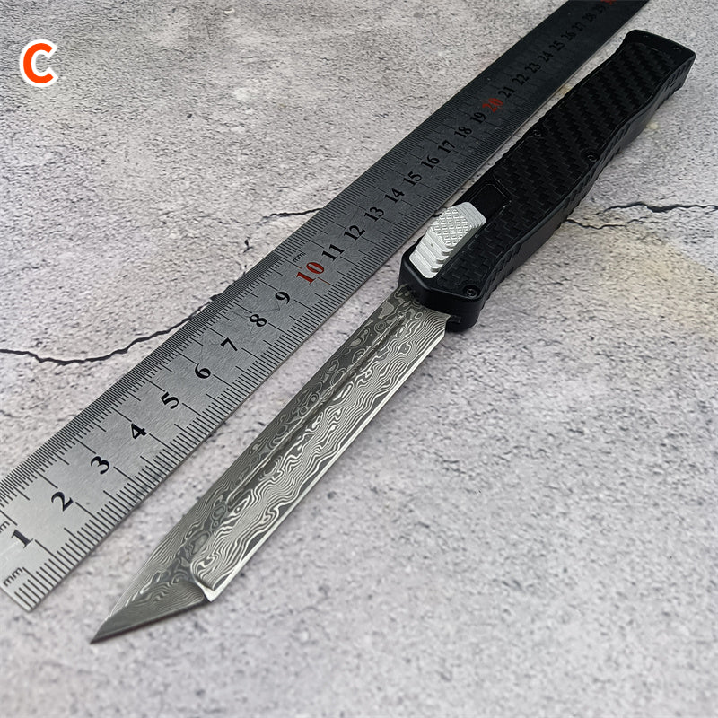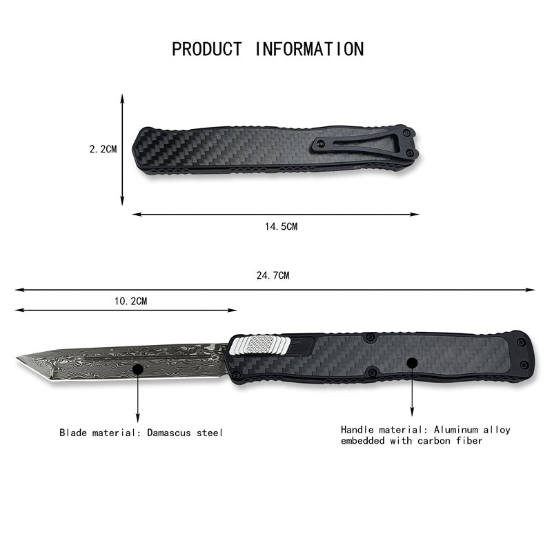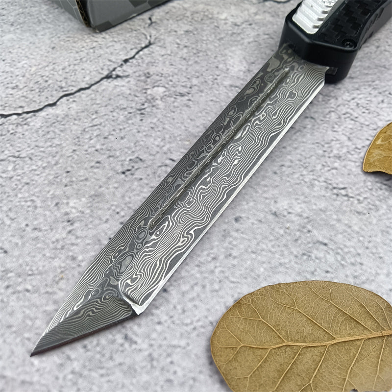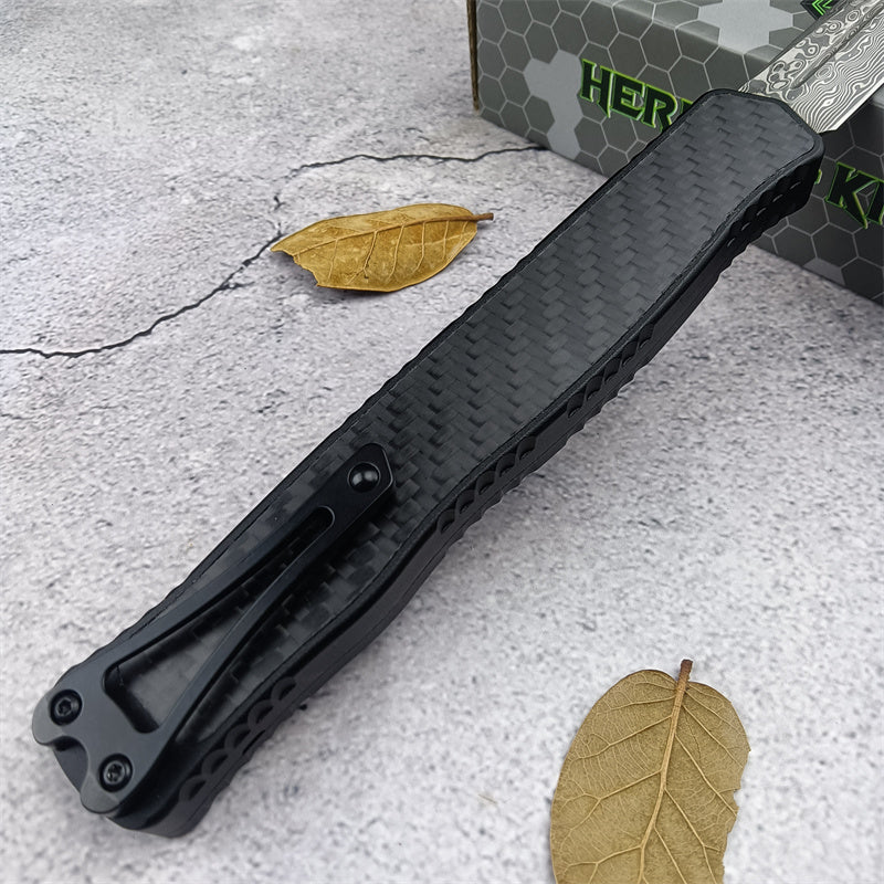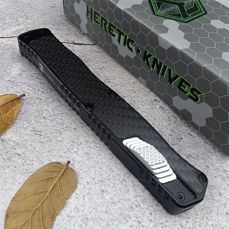 Heretic Knives Cleric II OTF AUTO Tactical Knife Double Edge Dagger Damascus Blade T6 Aluminum Alloy + Carbon Fiber Patch Handle EDC Button Opening Combat Military Knives